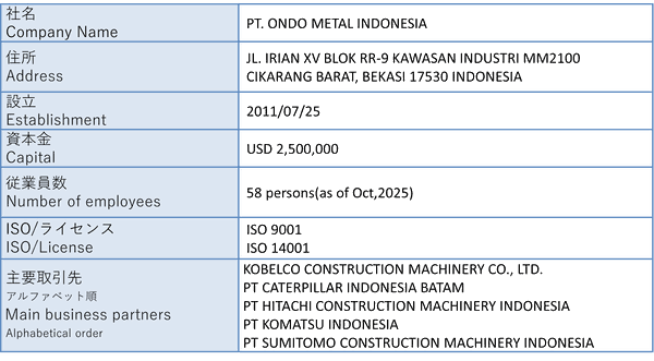 In 2011, we established PT. ONDO METAL INDONESIA and have since contributed to the development of Indonesia and the ASEAN region by supplying parts to construction machinery manufacturers.
